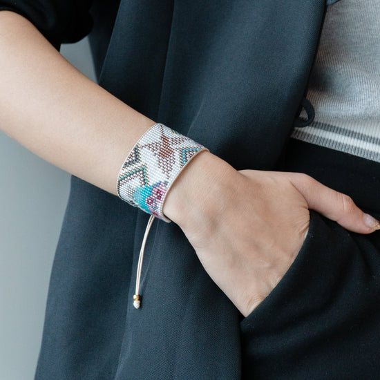 Inspired by the hummingbird of the Nazca Lines and Mount Fuji, with details from Peruvian textile iconography. A design from the Fusion Collection , which unites the cultures of Peru and Japan. Handwoven on a loom with Miyuki Delica beads, each piece is unique and made with dedication.