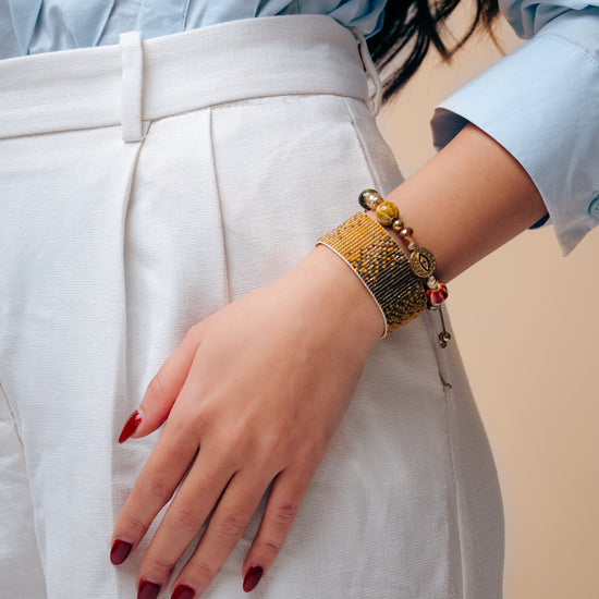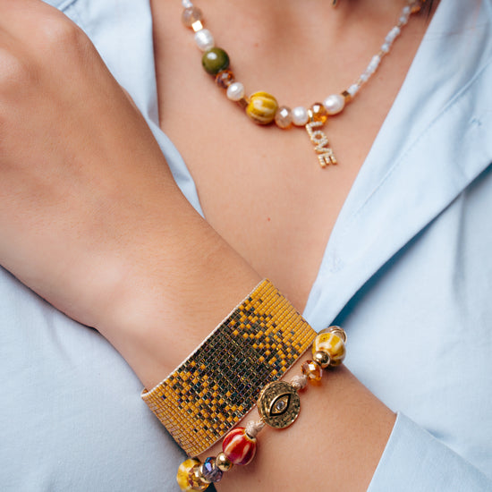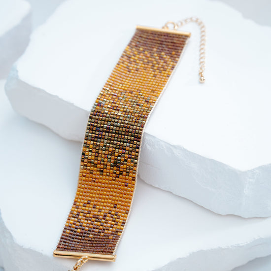 - Material: Miyuki Delica beads and gold-plated terminals