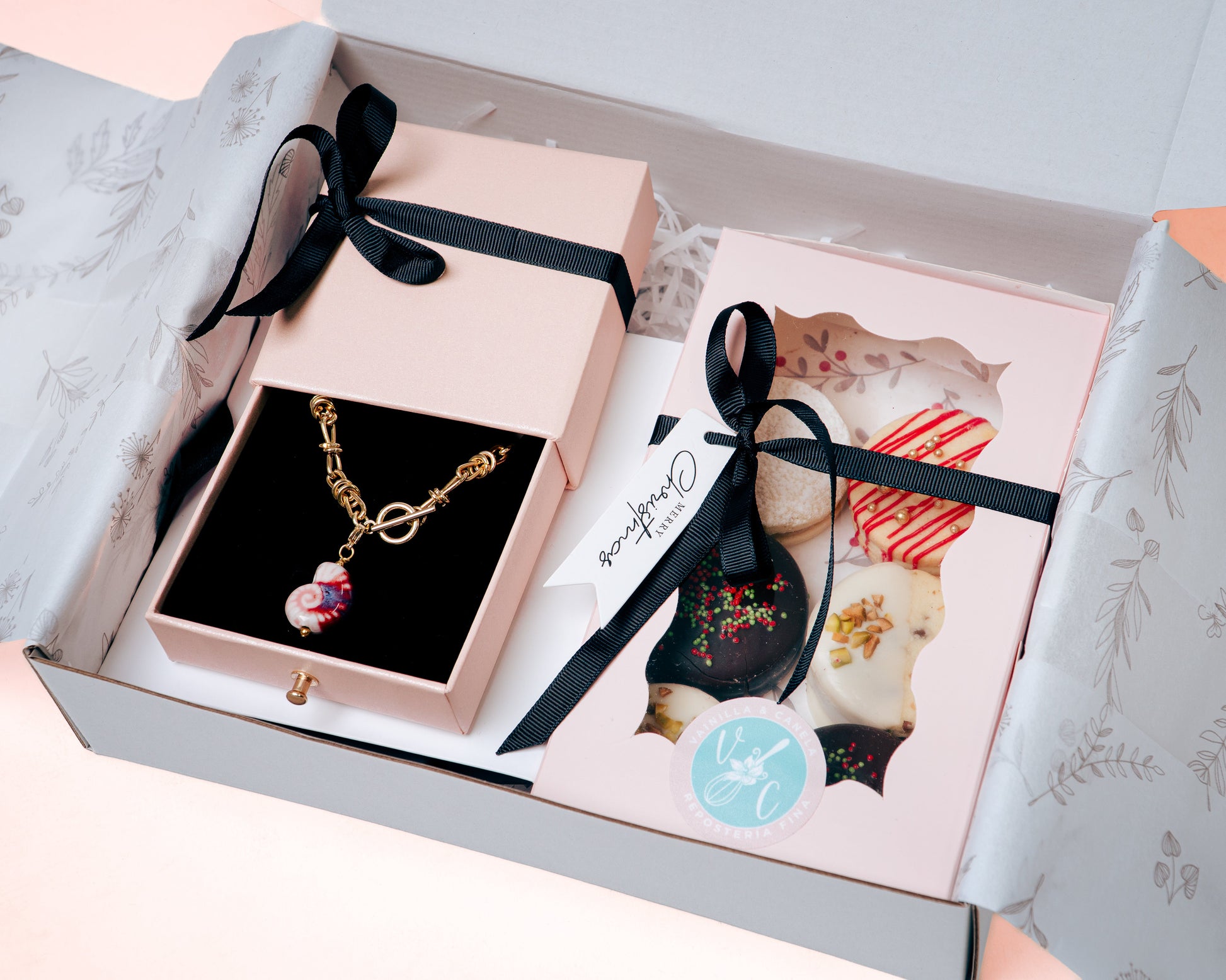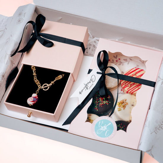 Un dúo fantástico. La dulzura y tradición en los distintos sabores de alfajores característicos de Vainilla & Canela y una hermosa pulsera con dije de cerámica y cadena de tendencia. Ambos con empaques premium.