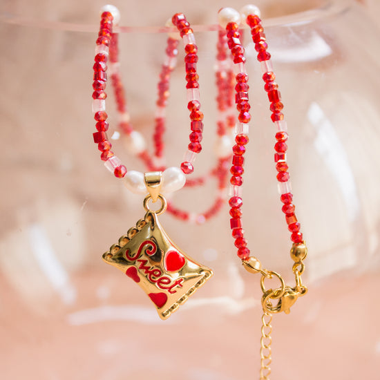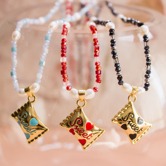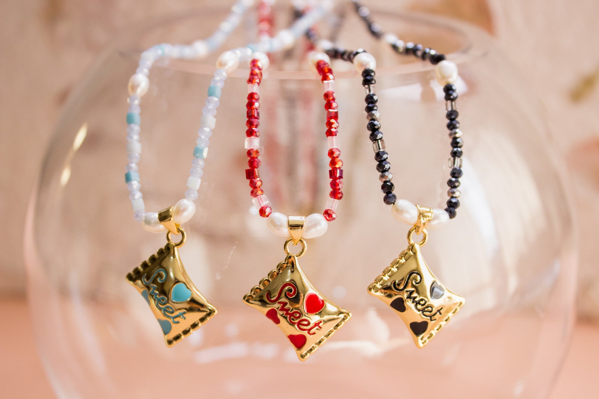 Un accesorio que transmite alegría y buena vibra. Pertenece a la colección Happy Fest, donde el color y la diversión son la inspiración. Los collares Candy Pop combinan perlas de río seleccionadas y murano ultra fino, con un dije en forma de caramelo que no pasará desapercibido. ¡Diviértete creando combinaciones en capas!