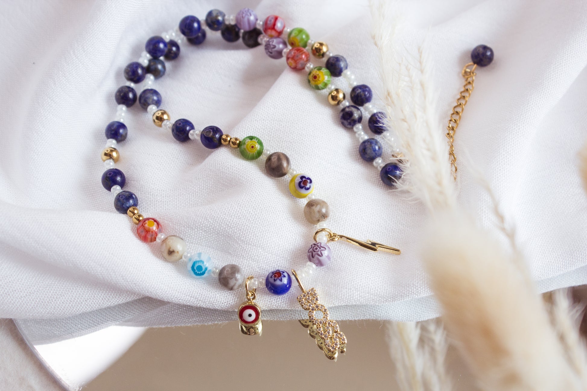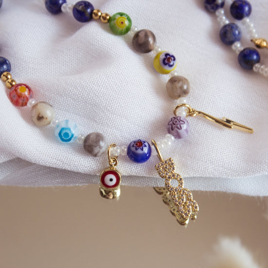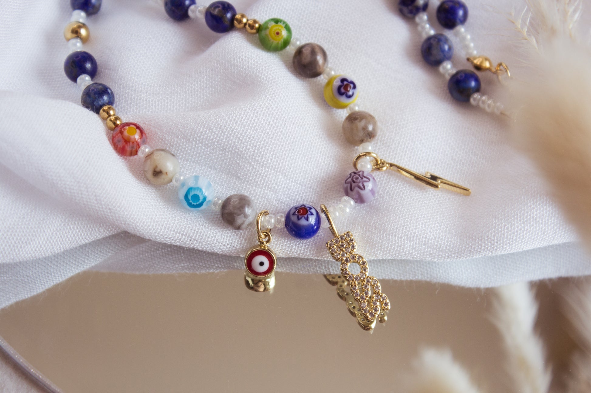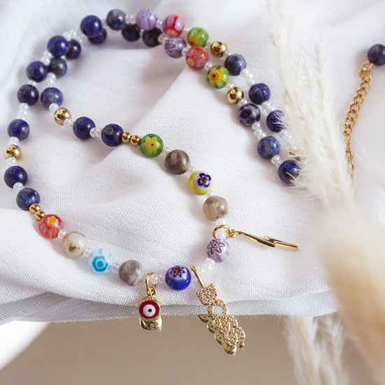Un diseño que lo tiene todo: lapislázuli y murrinas de vidrio que evocan la fuerza y el poder femenino, representados en sus tres dijes únicos: