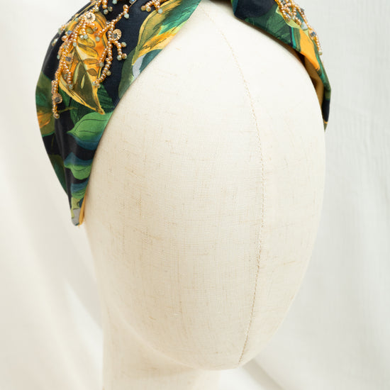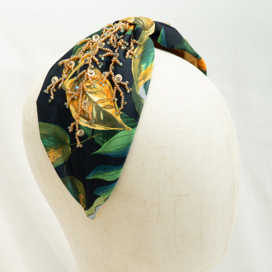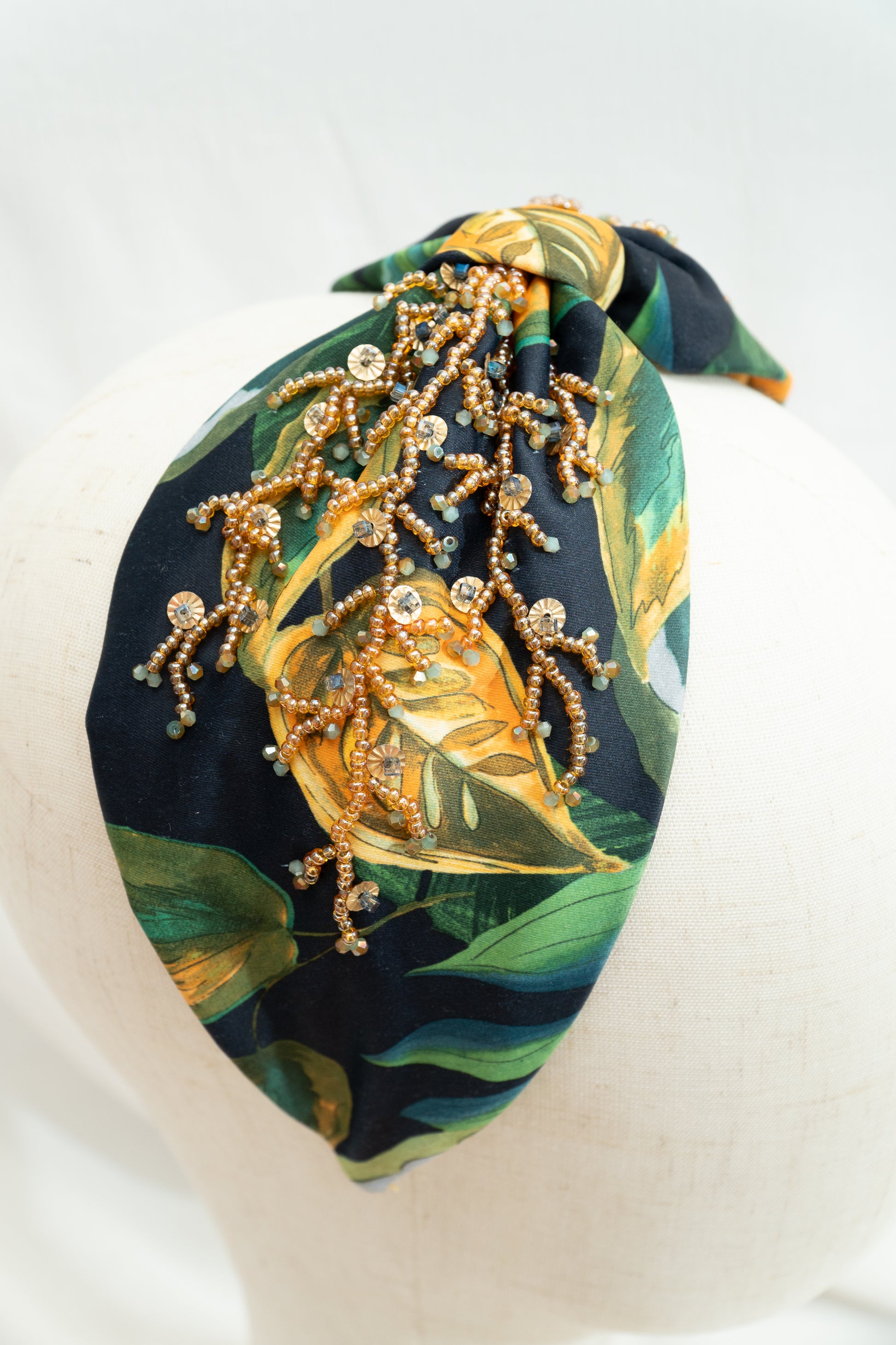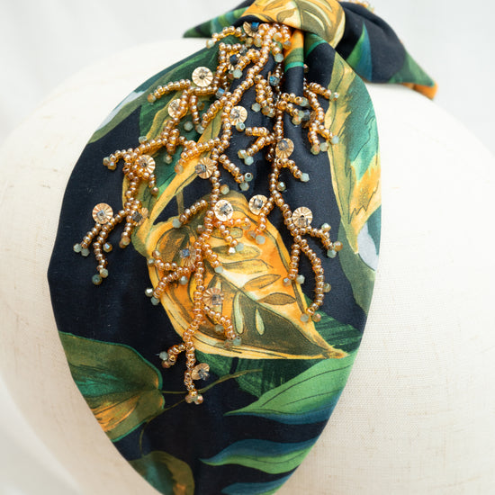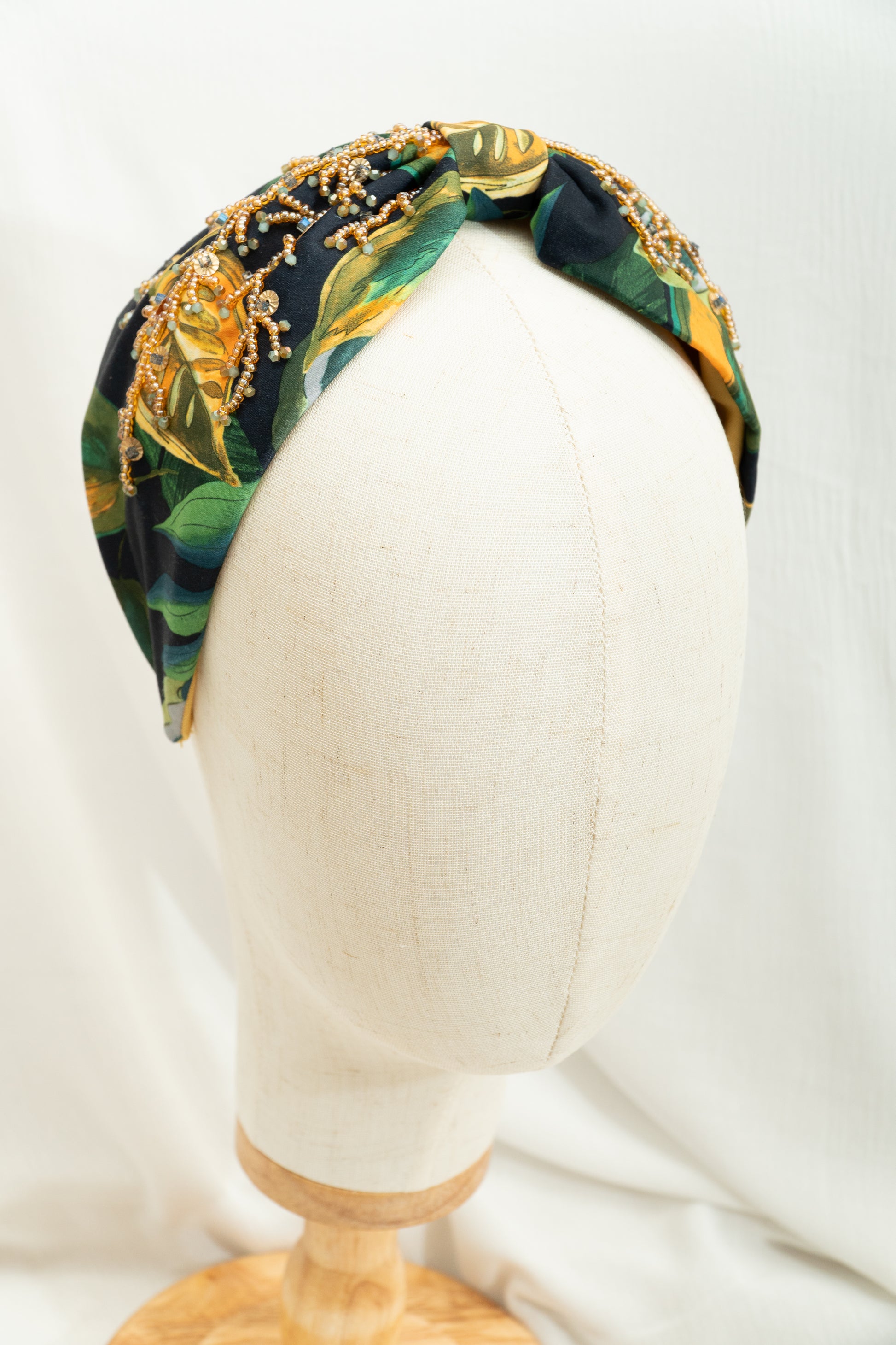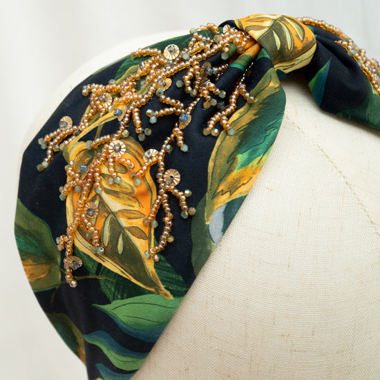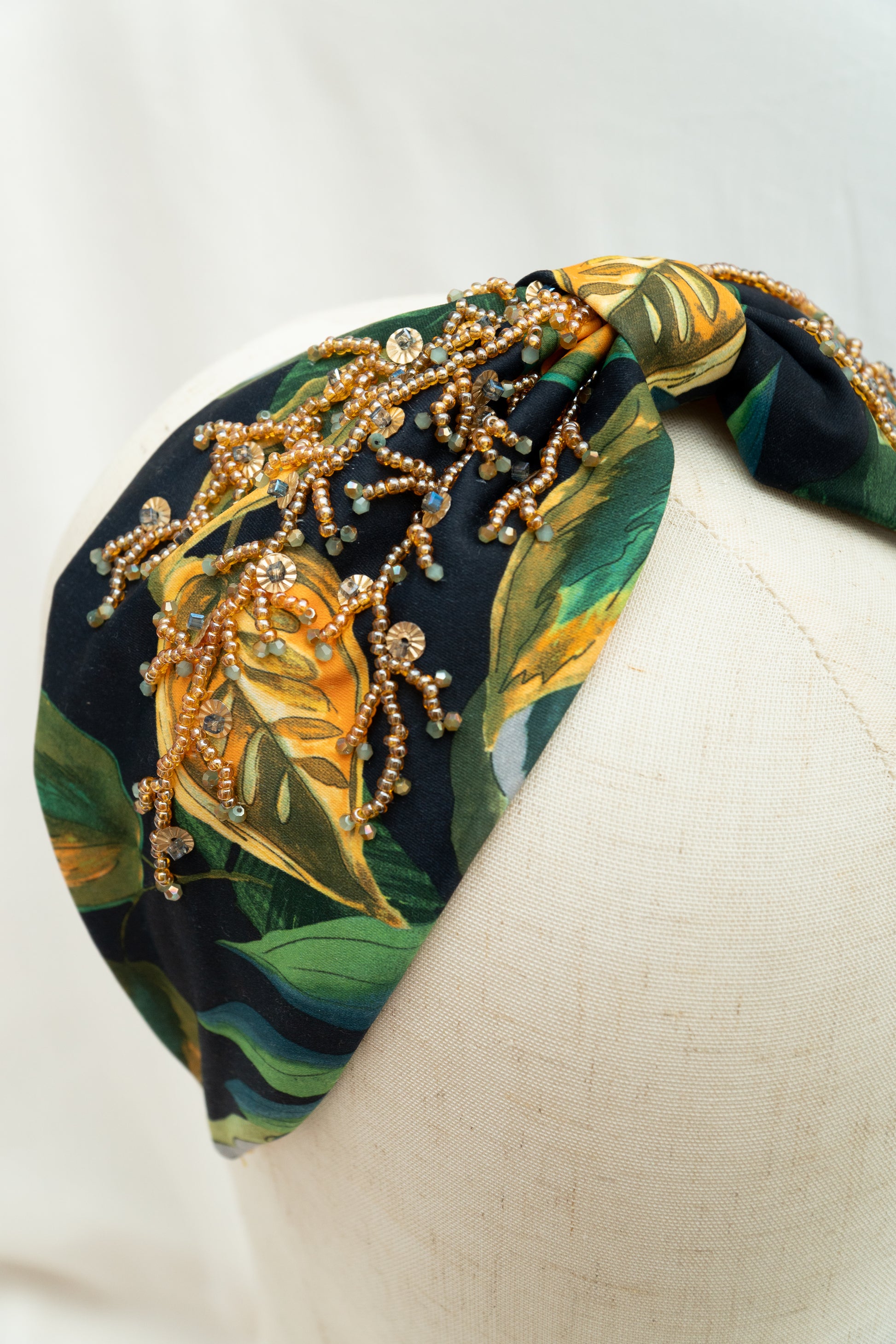 Un bello accesorio que refleja los colores y la esencia de los paisajes otoñales. Cada pedrería está cuidadosamente bordada a mano con diferentes técnicas, creando un diseño único y lleno de detalle.