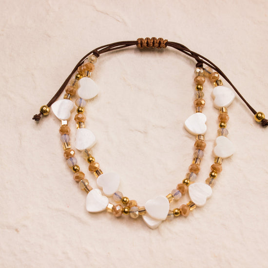 Pulseras dobles con un brillo que resalta, una pieza statement que no pasará desapercibida. Los corazones de nácar las hacen muy combinables con looks casuales hasta looks más chic. Diseño único y uno de nuestros best sellers.